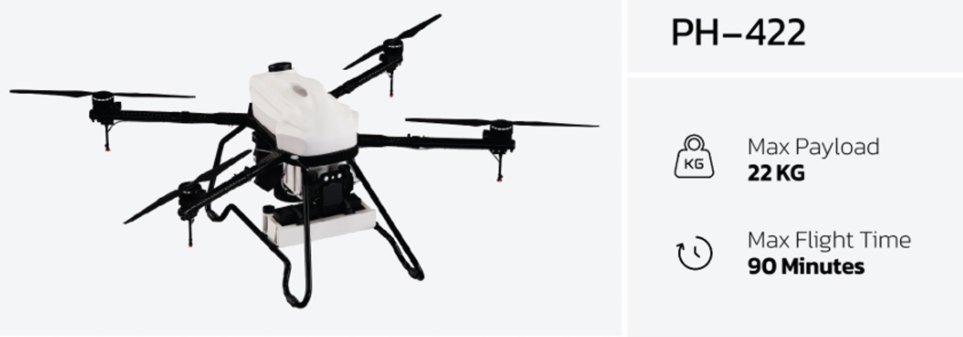 “The PH-422 features a revolutionary structural design with a four-rotor wide-body framework. It boasts a plug-in appearance pesticide tank integrated design, allowing for efficient operation. The front of the drone can be equipped with dual water pumps for precise distribution, obstacle avoidance radar, and a front FPV camera.