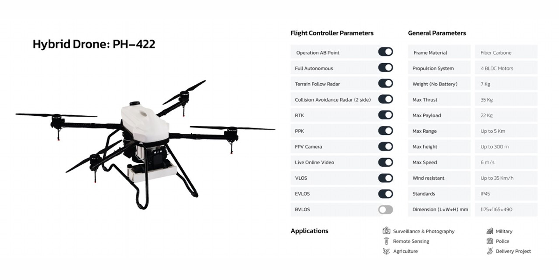 “The PH-422 features a revolutionary structural design with a four-rotor wide-body framework. It boasts a plug-in appearance pesticide tank integrated design, allowing for efficient operation. The front of the drone can be equipped with dual water pumps for precise distribution, obstacle avoidance radar, and a front FPV camera.